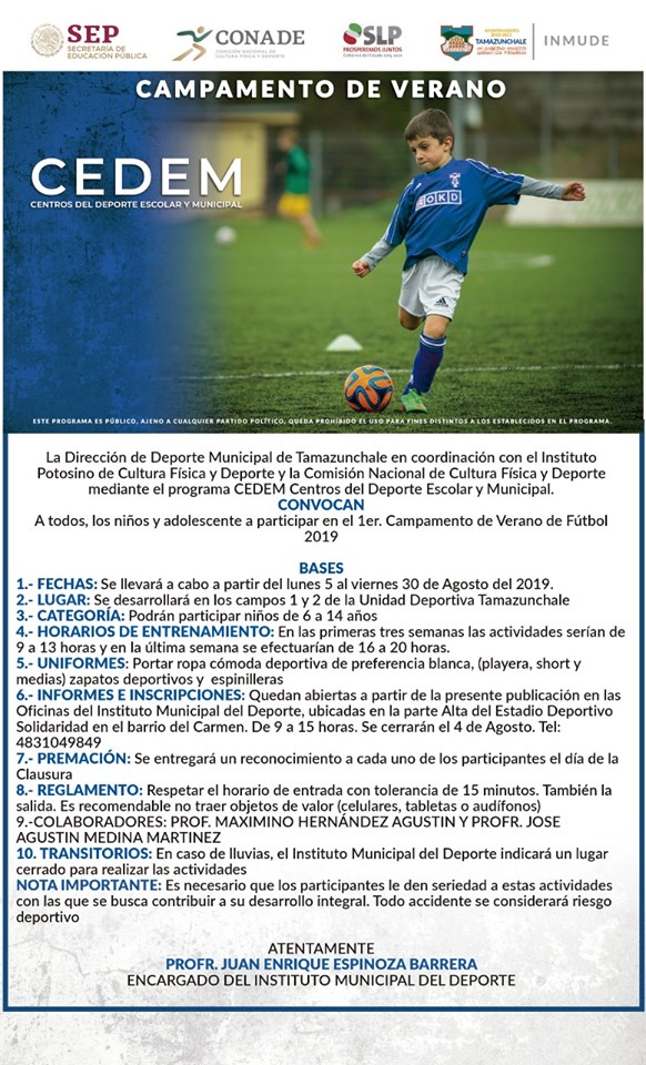 El Gobierno de Tamazunchale que preside el Arq. Juan Antonio Costa Medina a través de la Dirección de Deporte Municipal de Tamazunchale en coordinación con el Instituto Potosino de Cultura Física y Deporte y la Comisión Nacional de Cultura Física y Deporte mediante el programa CEDEM Centros del Deporte Escolar Municipal, convocan a los niños y adolescentes de entre 6 y 14 años a participar en este 1er. Campamento de Verano de Fútbol.