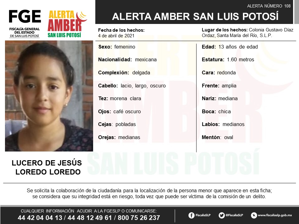 SANTA MARÍA DEL RÍO. – La Fiscalía General del Estado de San Luis Potosí (FGESLP), activó una Alerta Amber, para la localización de una menor de 13 años de edad, de nombre Lucero de Jesús Loredo Loredo, la cual fue vista por última vez en la colonia Gustavo Díaz Ordaz del municipio de Santa María del Río.