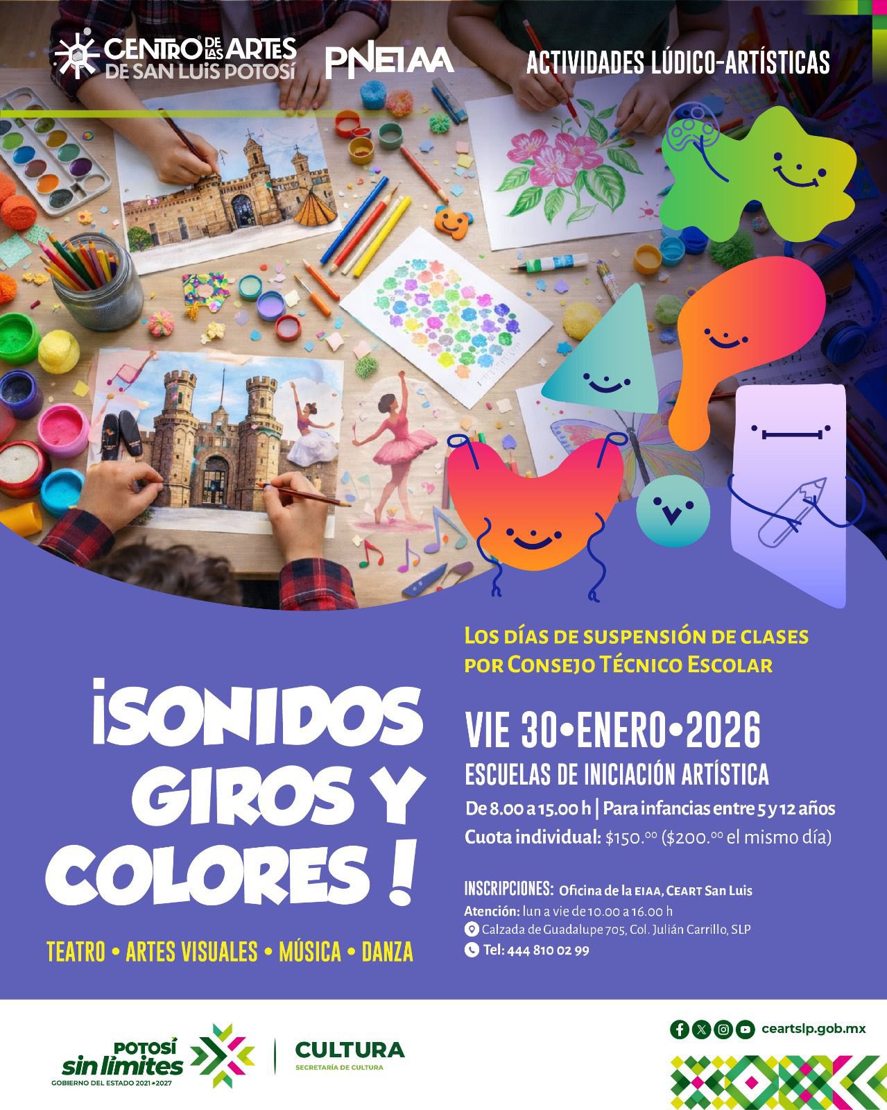 La actividad se llevará a cabo en las instalaciones del CEART San Luis Potosí, en un horario de 8:00 a 15:00 horas, y está dirigida a niñas y niños de 5 a 12 años de edad.