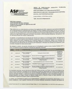 A través del Oficio UHLPTS/DPPA/047/2021, así respondió la Directora de Planeación y Programación de Auditorías de la ASF, Mtra. Lizet Ramírez García, a la solicitud presentada por el Diputado Federal Ricardo Delsol Estrada para investigar presuntos actos administrativos indebidos en distintos fondos y programas de la Secretaría de Salud del Gobierno del Estado de San Luis Potosí.