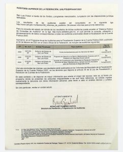 Dichas auditorías, afirmó, se encuentran indicadas en el Programa Anual de Auditorías para la Fiscalización Superior de la Cuenta Pública 202, publicado el 8 de febrero de 2021 en el Diario Oficial de la Federación. “Una vez concluidas las mismas, sus resultados serán publicados en los “Informes del Resultado de Fiscalización Superior de la Cuenta Pública 2020″, en los términos que dispone el artículo 30 de la Ley de Fiscalización y Rendición de Cuentas de la Federación”, indicó.