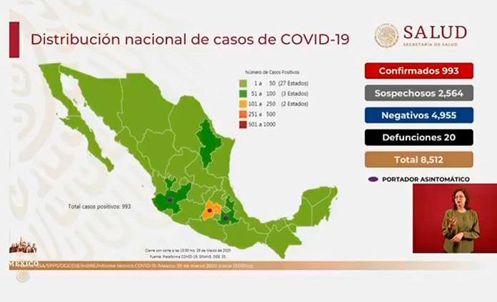El director general de Promoción de la Salud, Ricardo Cortés Alcalá, informó que hasta este domingo se han registrado 20 muertes a causa del nuevo coronavirus COVID-19 en el país y se tienen 993 casos confirmados.