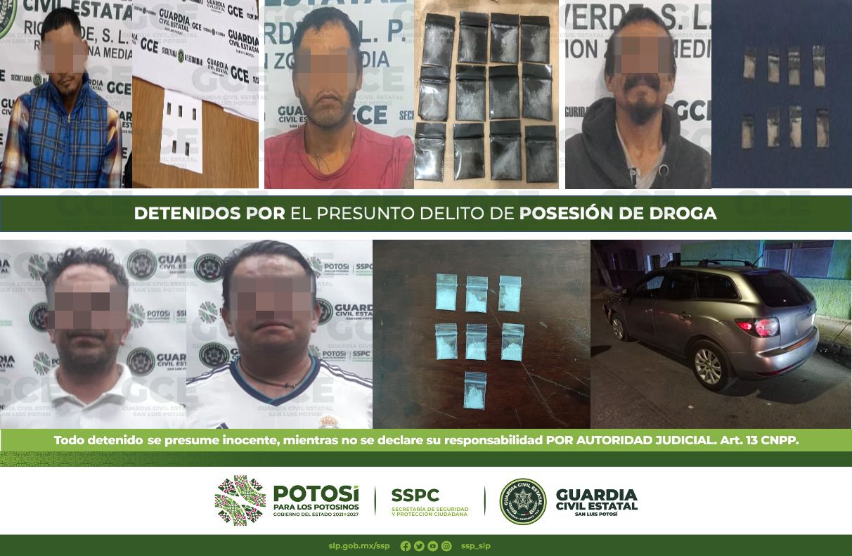 San Luis Potosí, S.L.P.- Como resultado de la estrategia integral de seguridad para inhibir el consumo, distribución y venta de drogas en la Entidad potosina, en diferentes acciones, elementos de la Guardia Civil Estatal detuvieron a 9 personas y aseguraron 88 dosis de estupefacientes.