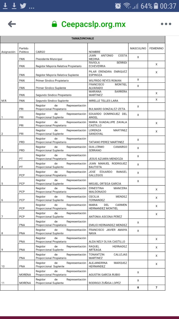 Quedando los partidos de la siguiente manera y sus respectivos regidores, el PAN, contará con 4 regidores, PRI -2, PRD -1, NA- 3, PT- 1, CP- 3 y MORENA-1.