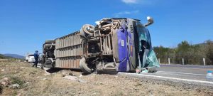 Una mujer falleció y 13 personas más resultaron lesionadas fue el saldo de la volcadura de un autobús en el kilómetro 80 de la súpercarretera a Rioverde.
