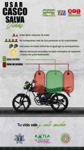 Entre las principales recomendaciones destaca el uso obligatorio del casco de seguridad, así como el respeto a los límites de velocidad, el apego al reglamento de tránsito y la conducción responsable, recordando que usar casco salva vidas.