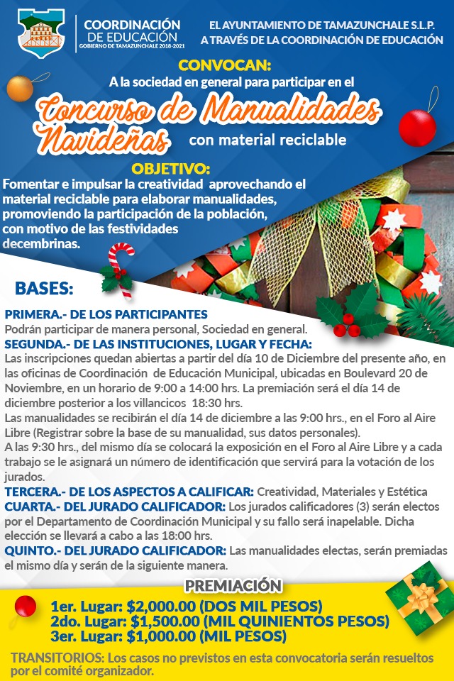 El H. Ayuntamiento de Tamazunchale, a través de la coordinación de educación, hace una invitación a la ciudadanía en general, a participar en el concurso de manualidades navideñas, con un sentido ecológico, elaboradas con material reciclable.