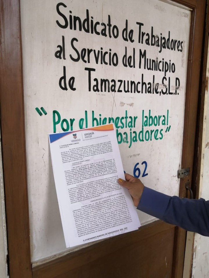 El día de ayer 26 de agosto del 2020 en un hecho inédito, personal del área jurídica del Ayuntamiento de Tamazunchale notificó la rescisión de contrato a dirigentes de los 3 sindicatos municipales, todo ello derivado de las políticas de ajuste salarial anunciadas por el ayuntamiento y a un análisis de la nómina y desempeño de sus funciones.