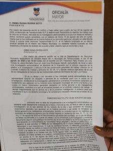 Palabras más palabras menos en el documento que fue entregado a cada uno de los dirigentes sindicales y en términos generales se especifica que… “a partir de hoy 26 de agosto del 2020 el municipio de Tamazunchale ha determinado rescindirle la relación de trabajo que la unía con el mismo, derivado de la investigación administrativa a la que fue citada en tiempo y forma”……. “de acuerdo al citatorio de fecha 13 de agosto del año en curso”… “mismo que le fue notificado en la misma fecha …..”.
