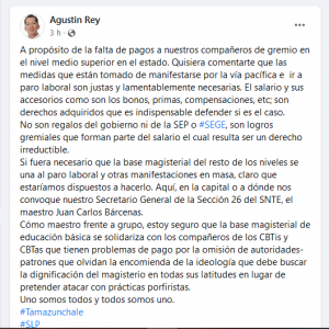 Uno de ellos, el Profr. Agustín Reyes Escamilla, quien actualmente se desempeña como  Maestro frente a grupo de la Escuela Primaria Jaime Nunó de Tamazunchale, y es Representante Sindical de la misma institución, aparte de haber ostentado en otros tiempos la Coordinación Municipal de la Sección 26 del SNTE en esta región de la huasteca, dijo; “A propósito de la falta de pagos a nuestros compañeros de gremio en el Nivel Medio Superior en el estado, quiero comentarles que las medidas que están tomando de manifestarse por la vía pacífica e ir a paro laboral son justas y lamentablemente necesarias”.