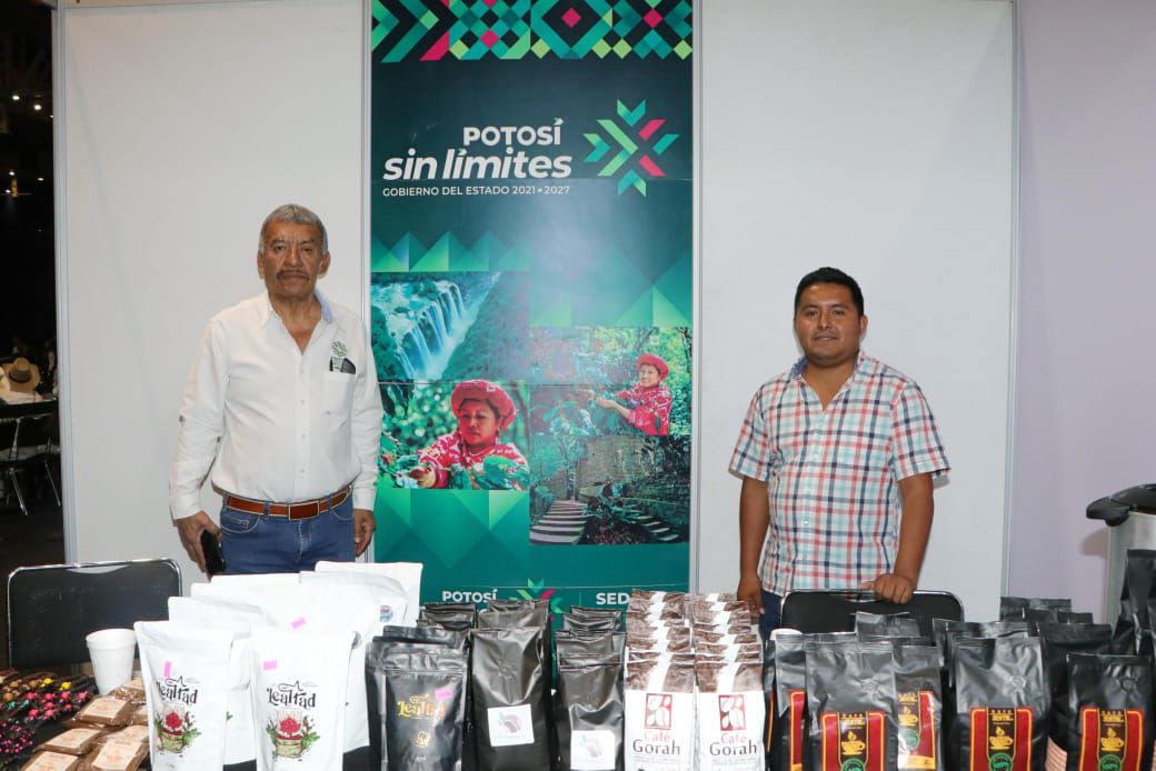 Xilitla está representado por Juan Carlos Félix Rodríguez, jefe de área del café en el municipio, y Abel Mateo Hernández, productor y expositor local, quienes acompañan al director estatal de Fomento y Desarrollo del Café, Emeterio Durán Suárez.