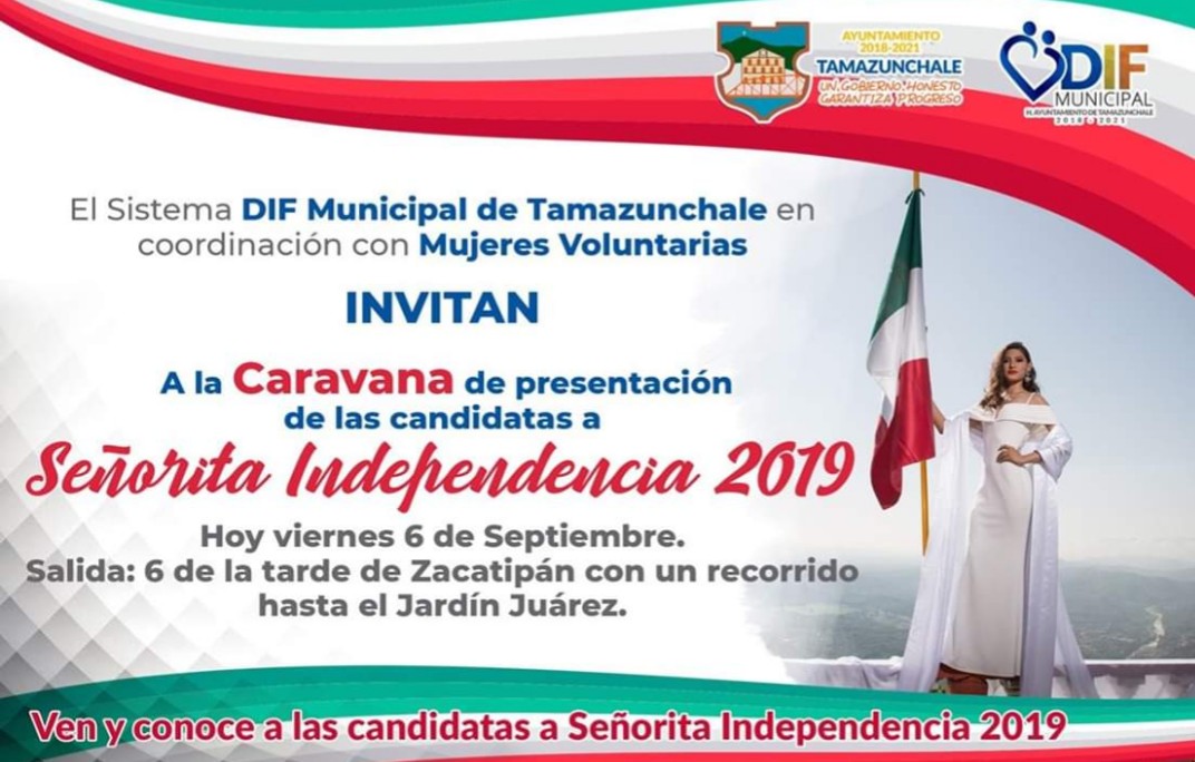 Tamazunchale, S.L.P. – Las candidatas a señorita Independencia 2019, realizarán esta tarde una caravana en punto de las 18:00 hrs partiendo desde Zacatipán hacía el Jardín Juárez.