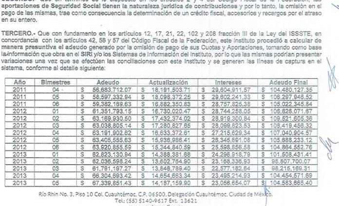 Los adeudos derivan de impagos atrasados de varios bimestres que se acumularon sin solventar durante los años 2011, 2012, 2013 y 2014: la SEGE hizo los descuentos a los trabajadores por concepto de seguros de retiro, cesantía y vejez, pero nunca enteró el dinero al ISSSTE. Con los moratorios, intereses y recargos, la cifra escaló por encima de los mil 200 millones de pesos.