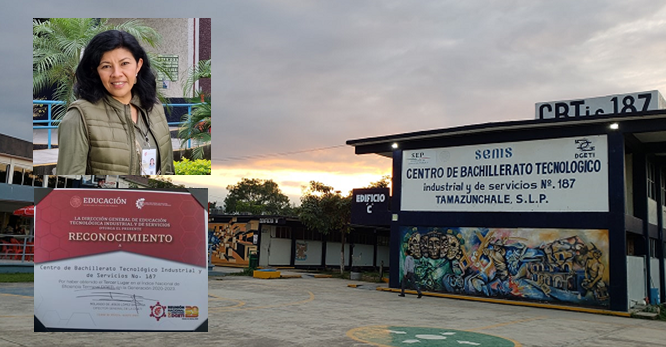 Correspondió a la Maestra Sandra Martínez Turiján, actual directora del CBTis 187 de Tamazunchale, y quien desde el inicio de su gestión ha marcado la pauta para seguir llevando a esta institución educativa de triunfo en triunfo en diversos aspectos tanto culturales, científicos y educativos, recibir éste 23 de agosto del 2023, de manos del Director General de la DGETI Dr. Rolando de Jesús López Saldaña, el reconocimiento que pone al CBTis 187 de Tamazunchale en un sitial muy privilegiado, ya que muy por encima de los demás planteles de la entidad potosina y de la República Mexicana, escala hasta alcanzar el Tercer Lugar a nivel nacional en uno de los aspectos más importantes mediante los que se evalúa la calidad de una institución educativa , que es la Eficiencia Terminal.