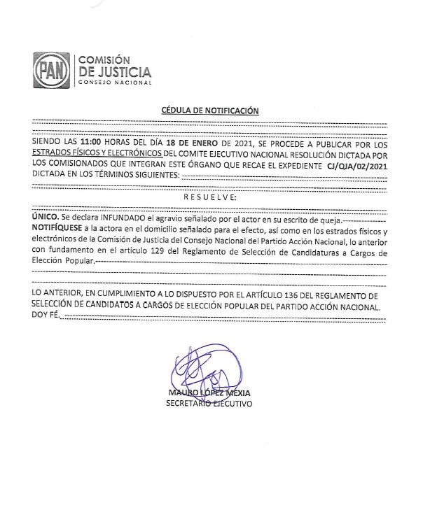 En un documento emitido por la misma comisión de Justicia, se notifica a Nava Palacios que los fundamentos presentados en dicha acusación no son suficientes y no logran cumplir con lo establecido para lograr la impugnación de la elección interna de pasado 10 de enero; todo esto con base en el artículo 129 del Reglamento de Selección de Candidaturas a Cargos de Elección Popular.