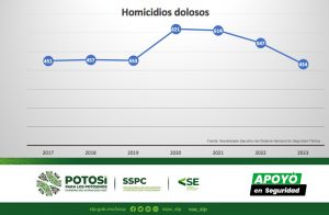 Con acciones y operativos altamente efectivos en apoyo a la tranquilidad y paz en territorio potosino, el Gobierno del Estado mantiene a San Luis Potosí por debajo de la media a nivel nacional en incidencia delictiva y durante 2023 delitos de alto impacto como homicidio doloso, feminicidio, secuestro, robo a casa habitación y robo de vehículos de cuatro ruedas, alcanzaron la cifra más baja de los últimos seis años.