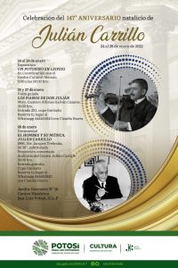 La Secretaría de Cultura recuerda la vida de Julián Carrillo, quien nació el 28 de enero de 1875 en Ahualulco, San Luis Potosí,  y falleció en la Ciudad de México el 9 de septiembre de 1965. Fue un gran compositor, director de orquesta, violinista y científico mexicano dentro de la corriente vanguardista internacional, considerado por especialistas como uno de los más importantes compositores de México y un importante pionero del microtonalismo.