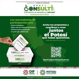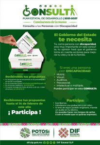 Con el fin de conocer, concentrar y responder a las inquietudes, necesidades y peticiones de la población potosina que padece alguna discapacidad, el Sistema Estatal para el Desarrollo Integral de la Familia (DIF) continúa en la recepción de propuestas mediante la Consulta a las Personas con Discapacidad, como parte de la integración del Plan Estatal de Desarrollo 2021-2027, ruta de trabajo que exhorta el Gobernador de San Luis Potosí, Ricardo Gallardo Cardona.