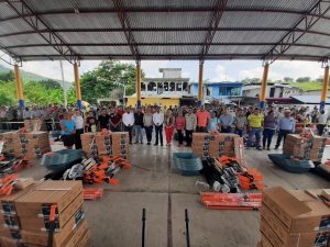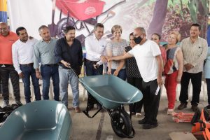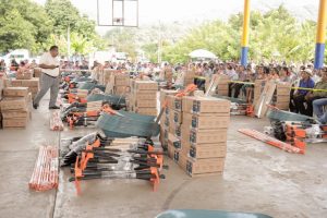 El equipamiento corresponde a la inversión de 6 millones de pesos realizada por el ayuntamiento y que por cuestiones de logística se llevará a cabo en 5 entregas, quedando pendientes 3 más, en donde a cada beneficiario se le otorga una carretilla, pala, barreta, machete y güingaros.