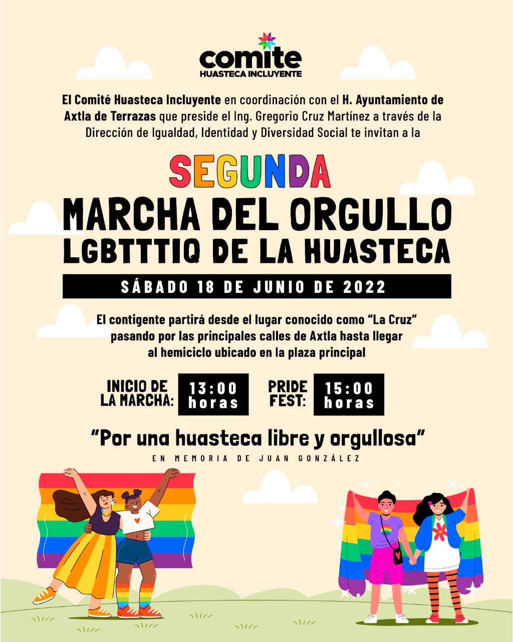Axtla de Terrazas, S.L.P.- El Comité Huasteca Incluyente en coordinación con el Gobierno Municipal de Axtla de Terrazas que preside el Ing. Gregorio Cruz Martínez, a través de la dirección de igualdad, identidad y diversidad social invita a la sociedad en general a la segunda Marcha del Orgullo LGBTTTIQ de la huasteca.