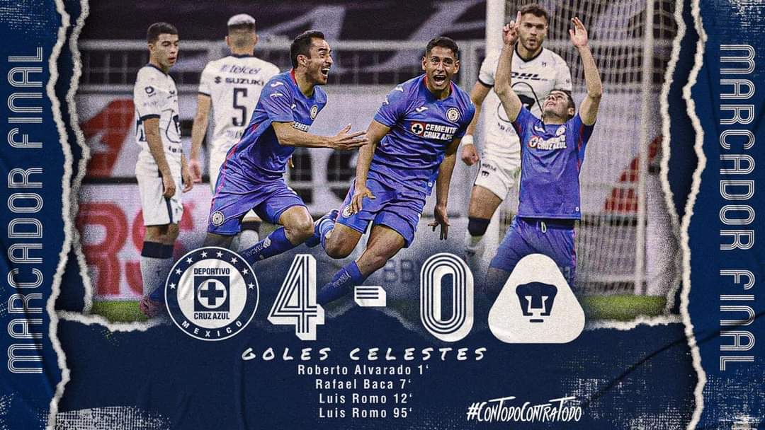 El Cruz Azul venció 4-0 a los Pumas este jueves en el partido de ida de la semifinal del torneo Guard1anes-2020 (ex Apertura-2020) del fútbol mexicano jugado en el estadio Azteca.