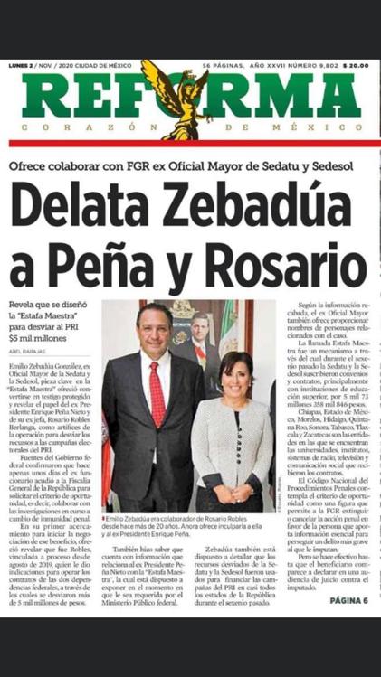 Emilio Zebadúa González, ex Oficial Mayor de la Sedatu y la Sedesol, pieza clave en la “Estafa Maestra” ofreció convertirse en testigo protegido y revelar el papel del ex Presidente Enrique Peña Nieto y de su ex jefa, Rosario Robles Berlanga, como artífices de la operación para desviar los recursos a las campañas electorales del PRI.