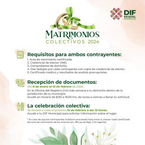 En apoyo a las parejas que desean formalizar legalmente su relación, el Sistema Estatal para el Desarrollo Integral de la Familia (DIF), que dirige la presidenta honoraria Ruth González Silva, mantendrá la inscripción para la campaña de Matrimonios Colectivos Gratuitos 2024, hasta el 12 de febrero, por lo que se invita a las y los interesados a acercarse a las oficinas del Registro Civil más cercanas a su domicilio.
