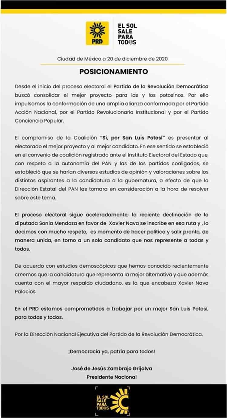 Tras la renuncia de Sonia Mendoza a la contienda interna del PAN y su denuncia de que no hay piso parejo en el blanquiazul, el PRD detalló que “desde el inicio del proceso electoral el Partido de la Revolución Democrática buscó consolidar el mejor proyecto para las y los potosinos. Por ello impulsamos la conformación de una amplia alianza conformada por el Partido Acción Nacional, por el Partido Revolucionario Institucional y por el Partido Conciencia Popular.