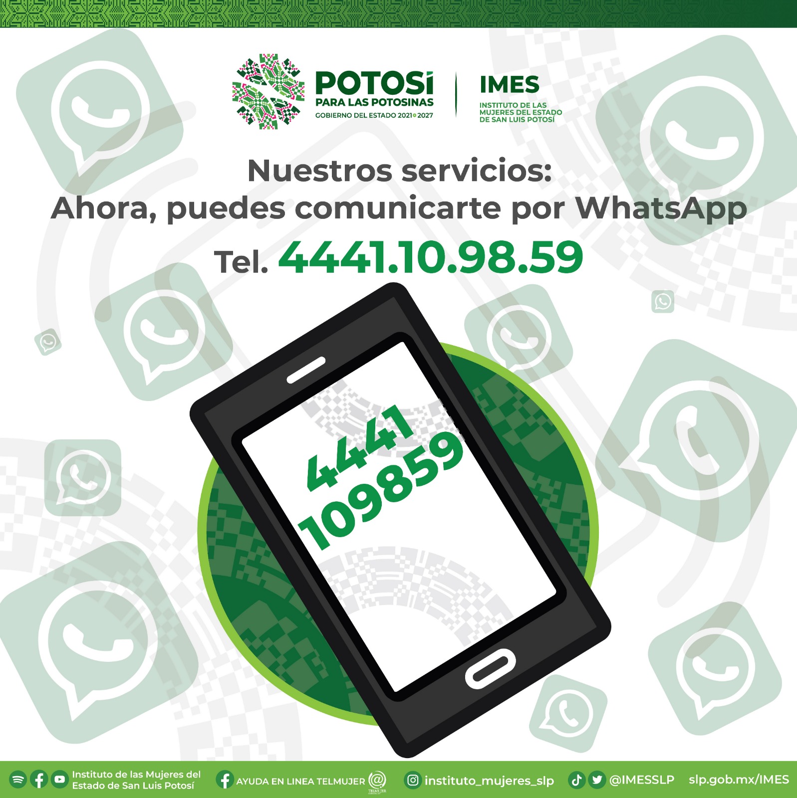 Como parte de las acciones para diversificar los servicios que se ofertan a favor de la igualdad y la erradicación de la violencia contra las mujeres y para reforzar la atención a las potosinas con asesoría jurídica y orientación psicológica, como lo ha definido el Gobierno del cambio que encabeza Ricardo Gallardo Cardona, el Instituto de las Mujeres (Imes), a través del Área de Atención Ciudadana puso en funcionamiento el nuevo servicio de WhatsApp 444 110 9859.