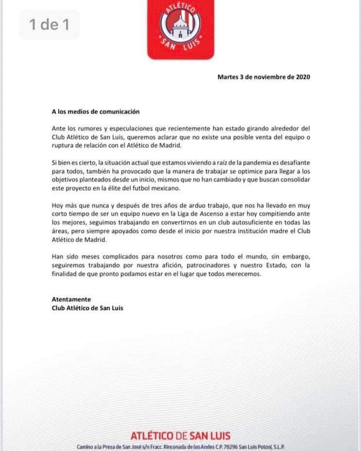 Ante los rumores y especulaciones que recientemente han estado girando alrededor del Club Atlético de San Luis, queremos aclarar que no existe una posible venta del equipo o ruptura de relación con el Atlético de Madrid.
