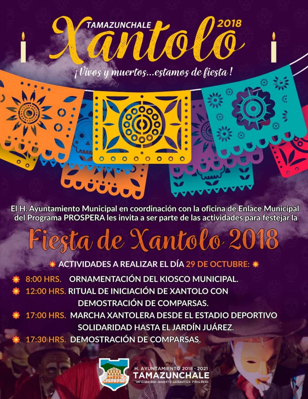 El H. Ayuntamiento Municipal en coordinación con la oficina de Enlace Municipal del Programa PROSPERA a cargo de la Lic. Berenice Martínez Hernández los invitan a ser parte de las actividades organizadas para festejar Xantolo 2018.