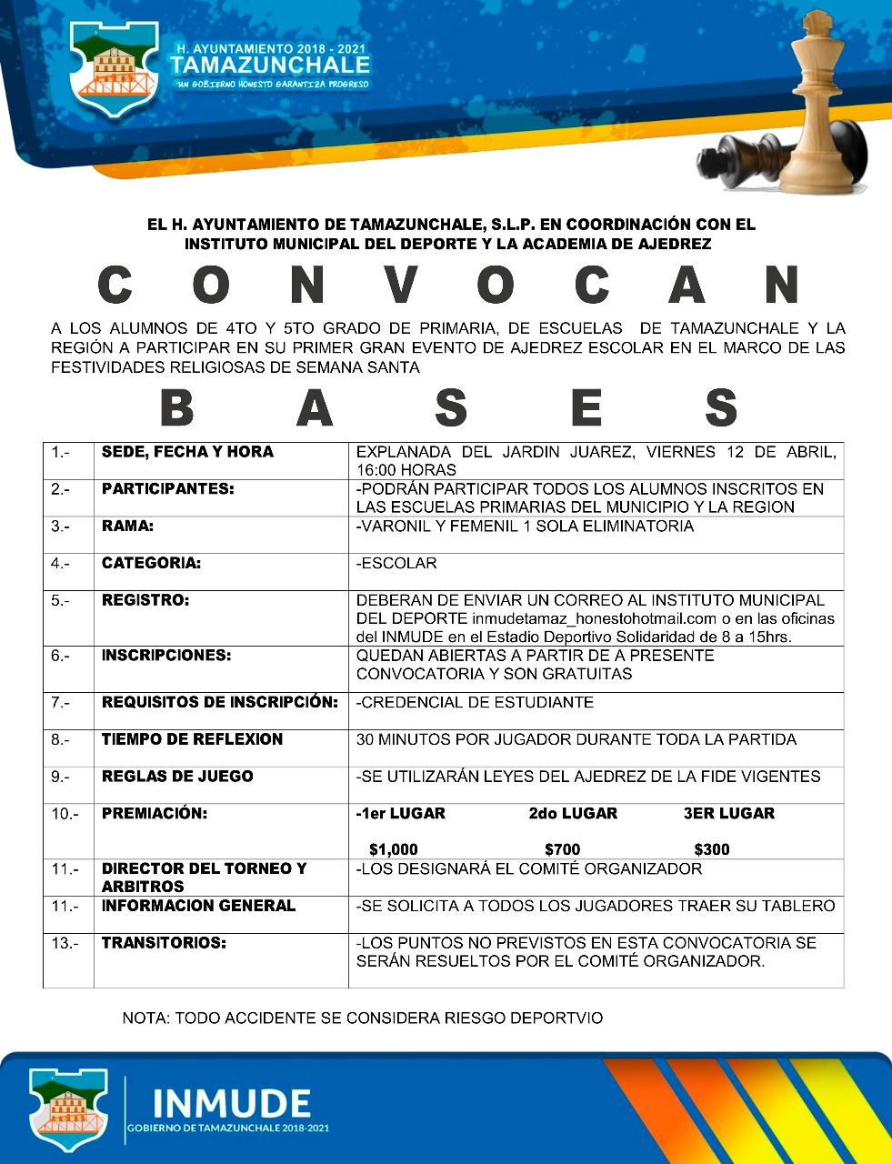 En el marco de las actividades de Semana Santa 2019 el Honorable Ayuntamiento de Tamazunchale que encabeza el Arq. Juan Antonio Costa Medina a través del Instituto Municipal del Deporte y la academia de ajedrez lanza esta convocatoria dirigida a los alumnos de 4to y 5to grado de primaria para que participen en este gran evento de Ajedrez.