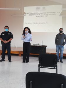 Asistiendo a las instalaciones de la universidad autónoma de S.L.P donde la coordinadora del área, Dra. Denison Selene Sánchez Miguel y el L.E. Camerino Cruz Campos más tres colaboradoras de la licenciatura en enfermería apoyaron para dar por inaugurado el curso estando presente el Cmte. Armando Martínez García más aproximadamente 22 elementos
