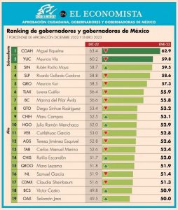 De acuerdo con el Ranking Mitofsky, medición mensual realizada para El Economista, el Mandatario potosino, se ubica dentro de las y los gobernadores con aprobación Alta, por arriba de Querétaro, Tlaxcala, Baja California, Guanajuato, Chihuahua e Hidalgo, además de resaltar su posición en segundo lugar nacional de las y los afines a Morena, luego de Sinaloa.