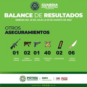 Además se aseguró un arma de fuego corta, un arma larga, dos armas de fuego de confección artesanal conocidas como cachimbas, se aseguraron 40 cartuchos útiles y dos cargadores. También se aseguraron 6 armas prohibidas.