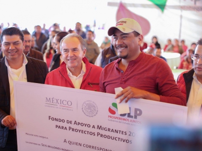 Ciudad Fernández, S.L.P.- Tras encabezar la entrega de 492 proyectos productivos para hombres y mujeres que regresaron a México de los Estados Unidos, el Gobernador del Estado Juan Manuel Carreras López, puntualizó que en San Luis Potosí se están impulsando más oportunidades para el desarrollo de sus familias, por lo que anunció la Feria del Empleo para migrantes, para que los repatriados logren integrarse a un fuente laboral formal.