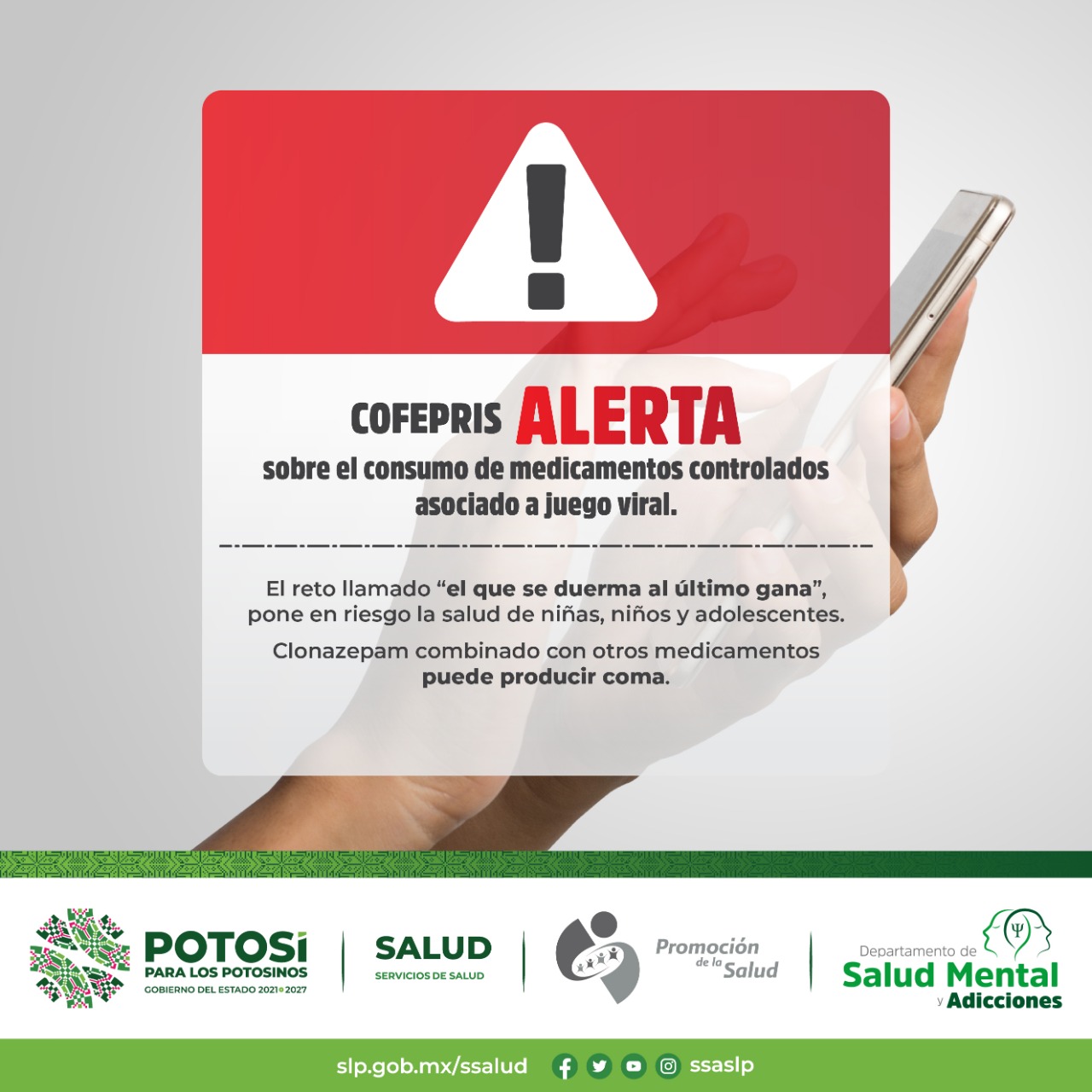 El Gobierno del cambio, a través de la Secretaría de Salud Estatal, hizo llegar a farmacias de las cuatro regiones de la entidad, la alerta emitida por la Comisión Federal para la Protección contra Riesgos Sanitarios (Cofepris) sobre el consumo de medicamentos controlados que inducen al sueño al tener efectos negativos a la salud, luego de que el reto viral, “el que se duerma al último gana”, provocó la intoxicación de niñas, niños y adolescentes en algunos lugares, incluyendo en el municipio de Ciudad Valles.
