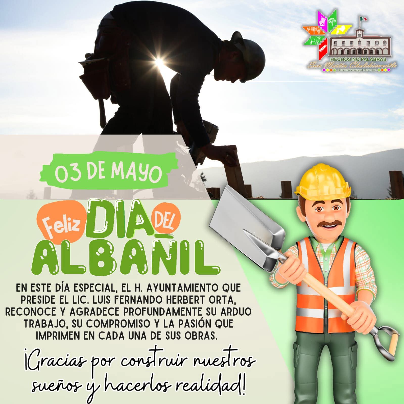 El H. Ayuntamiento Municipal de San Martín Chalchicuautla, que dignamente preside el Lic. Luis Fernando Herbert Orta, extiende un cordial y sincero saludo a todos los albañiles en su día.