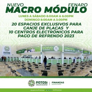 Por instrucción del Gobernador de San Luis Potosí, Ricardo Gallardo Cardona, la Secretaría de Finanzas (Sefin) abrirá el próximo martes un macro módulo en las instalaciones de la Feria Nacional Potosina (Fenapo), exclusivamente para trámites de canje de placas pendientes de entregar y pago de refrendo vehicular 2023 con la finalidad de agilizar los trámites y hacer más eficiente el servicio dirigido a la ciudadanía.