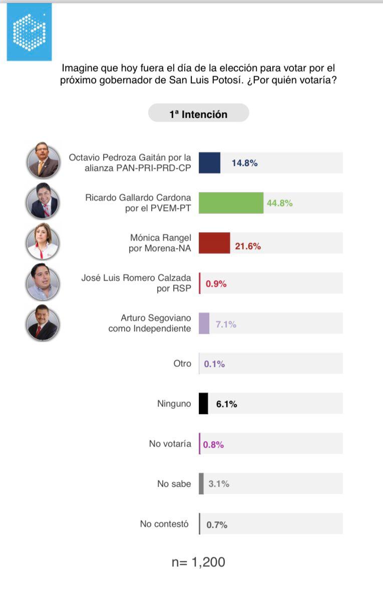 En la gran mayoría de las preguntas, la gente respondió dando un respaldo a Gallardo que lo ubica por lo general con un doble de preferencia respecto de los demás contendientes. Así, aparece con una intención del voto de 44.8%, seguido por Mónica Rangel Martínez con un 21.6%, y luego Octavio Pedroza Gaitán con un 14.8%, en caso de que hoy fueran las elecciones.