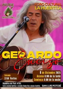 El talento del reconocido cantautor Gerardo Enciso podrá disfrutarse en San Luis Potosí el próximo 6 de diciembre de 2025, fecha en la que ofrecerá un concierto íntimo en el Foro Cultural La Huertita, espacio ubicado en República del Perú #355, entre avenida Antillas y avenida Simón Díaz, en la colonia Satélite.