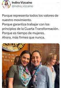 Vizcaíno, expuso que Sheinbaum representa todos los valores del movimiento y garantiza trabajar con los principios de la Cuarta Transformación; “Porque es tiempo de mujeres. Ahora, más firmes que nunca”, tuiteó.