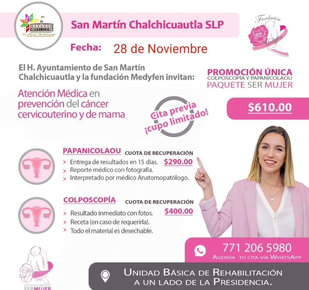 El H. Ayuntamiento Municipal que preside el Lic. Luis Fernando Herbert Orta, en coordinación con la fundación Medyfen te invitan a asistir a las consultas de atención médica para la prevención del cáncer cervicouterino y de mama.