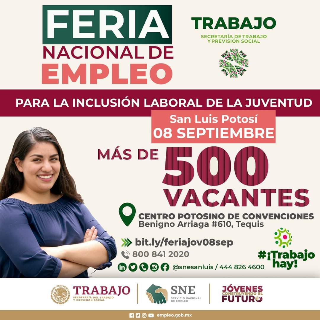 El Gobierno del cambio encabezado por Ricardo Gallardo Cardona, en coordinación con el Gobierno de México, a través de las Secretarías del Trabajo y Previsión Social (STyPS) impulsan la “Feria Nacional de Empleo para la Inclusión de la Juventud”, que se llevará a cabo el próximo jueves 8 de septiembre en el Centro Potosino de Convenciones, ubicado en Benigno Arriaga #610, colonia Tequisquiapan.