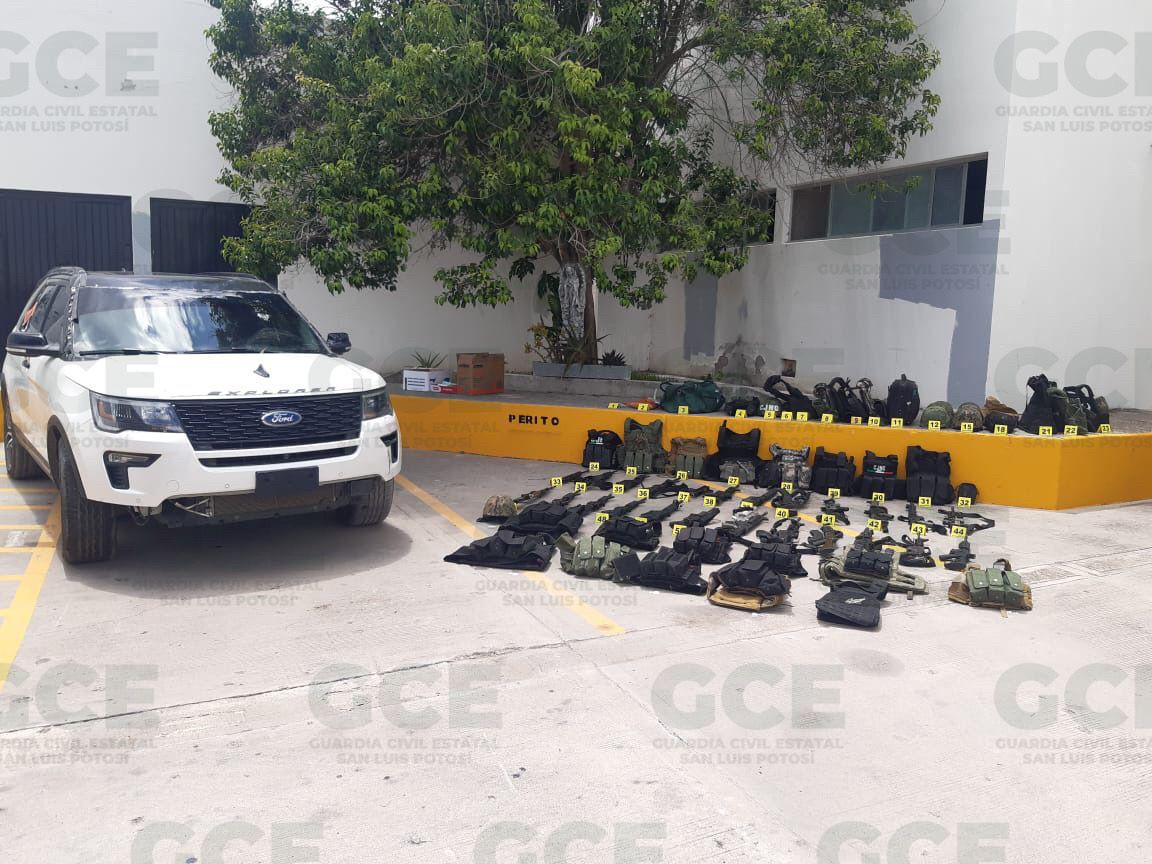 Rioverde, S. L.P.- Nuevamente, la Secretaría de Seguridad y Protección Ciudadana (SSPC) de San Luis Potosí efectúa acciones contundentes contra la delincuencia organizada en la región Media, logrando asegurar múltiples armas de fuego, un vehículo y equipo táctico que presuntamente integrantes de células criminales usaban para perturbar la paz y tranquilidad pública de la zona.