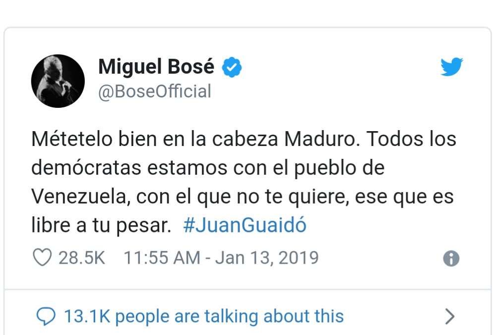 Miguel Bosé, el cantante español con más de 40 años de carrera musical, se abocó a sus redes sociales para manifestar sin rodeos su repudio a Maduro y el apoyo al pueblo venezolano.