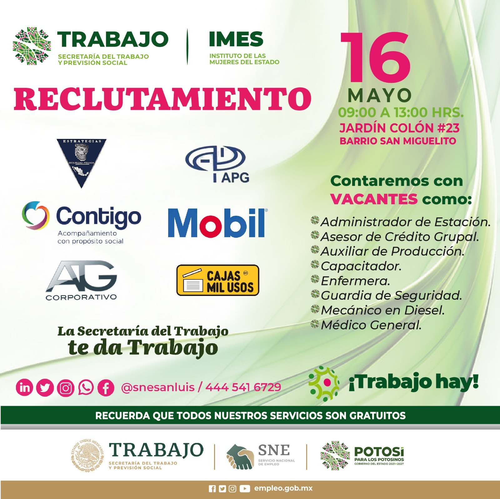 Atendiendo la instrucción del Gobernador de San Luis Potosí, Ricardo Gallardo Cardona, de generar más oportunidades laborales para todas y todos y, en seguimiento a la estrategia “la Secretaría del Trabajo te da trabajo”, el martes 16 de mayo de las 9:00 a las 13:00 horas, el Instituto de las Mujeres del Estado (Imes), realizará en sus instalaciones, la quinta Jornada de Reclutamiento.