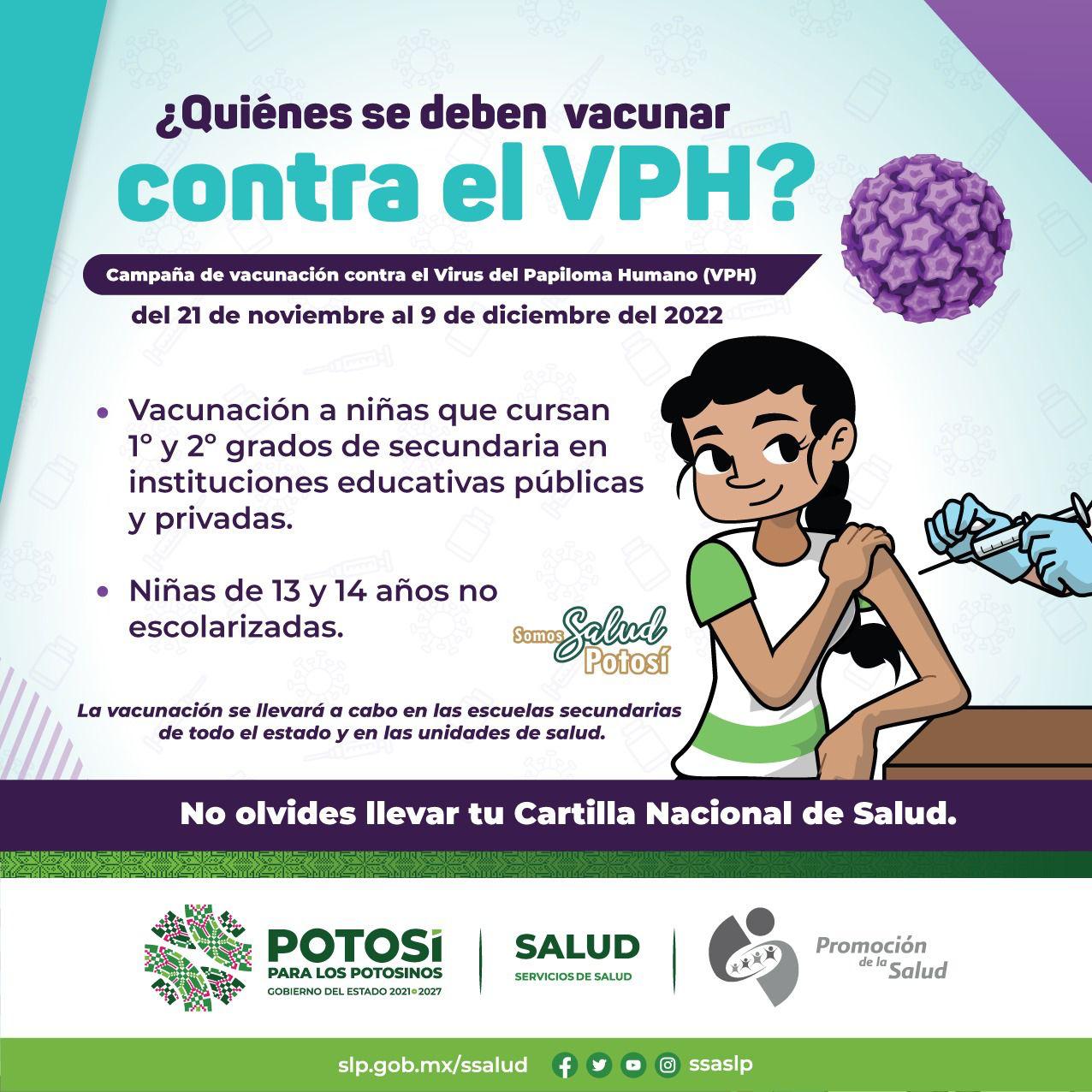 Resultado de la estrategia para garantizar la salud de las y los potosinos, promovida por el Gobernador de San Luis Potosí Ricardo Gallardo Cardona, del 21 de noviembre al 9 de diciembre se llevará a cabo en la entidad, la campaña Nacional de Vacunación, donde niñas de 13 y 14 años, podrán recibir la vacuna que protege contra el Virus del Papiloma Humano (VPH).