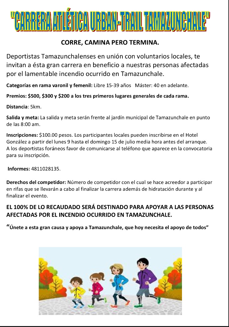 Este domingo 15 de julio se realizará la CARRERA ATLÉTICA URBAN -TRAIL TAMAZUNCHALE con el objetivo de recaudar fondos para apoyar a los compañeros afectados por el incendio ocurrido el pasado día 7 del presente.