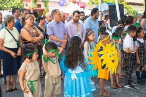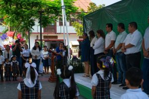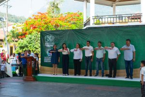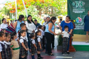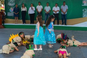 La ceremonia se realizó en un ambiente de respeto y compromiso con los valores patrios, destacando la participación de las niñas y niños que integraron la escolta y entonaron el Himno Nacional y un mensaje del cuidado del agua a través de una danza.